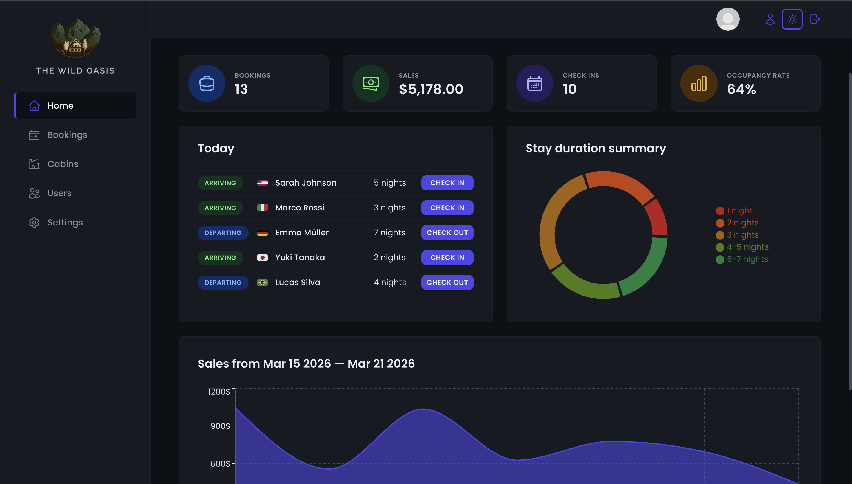 The Wild Oasis - Owner Dashboard is an internal admin panel built with Next.js and Supabase, styled with Tailwind CSS. It empowers hotel owners and staff to efficiently manage cabins, guests, and bookings, monitor sales performance, and visualize occupancy insights in real-time.